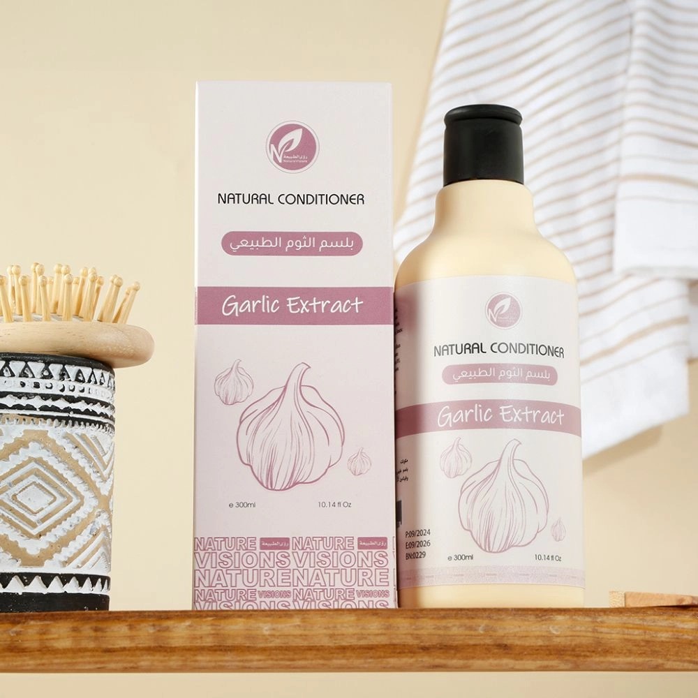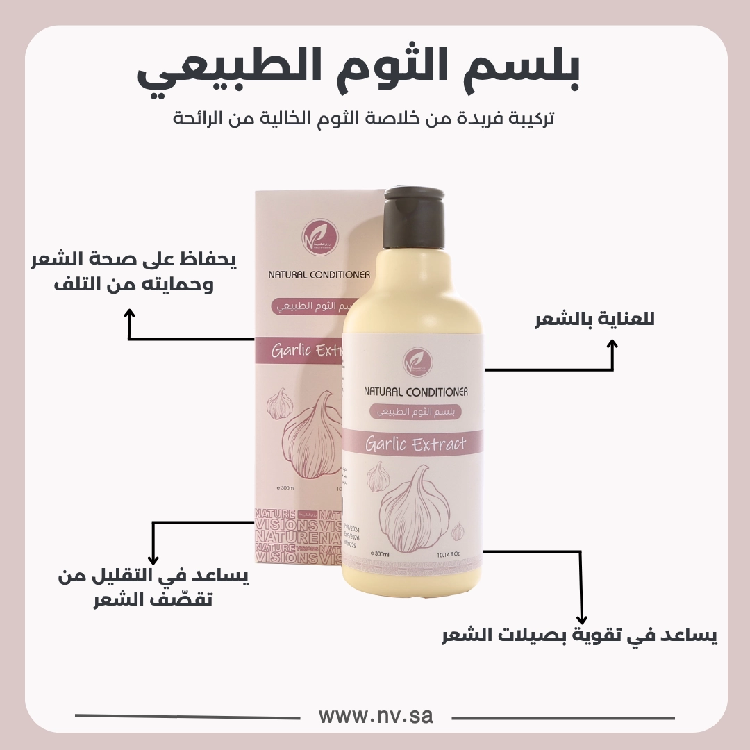 يتميز بلسم الثوم الطبيعي من رؤى الطبيعة بالمكونات الفعالة والمثالية للعناية بالشعر، ويحتوي على تركيبة فريدة من خلاصة الثوم الخالية من الرائحة،و الصبار و زيت اللوز الحلو وفيتامين B5