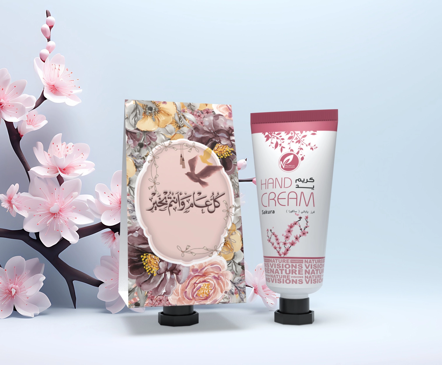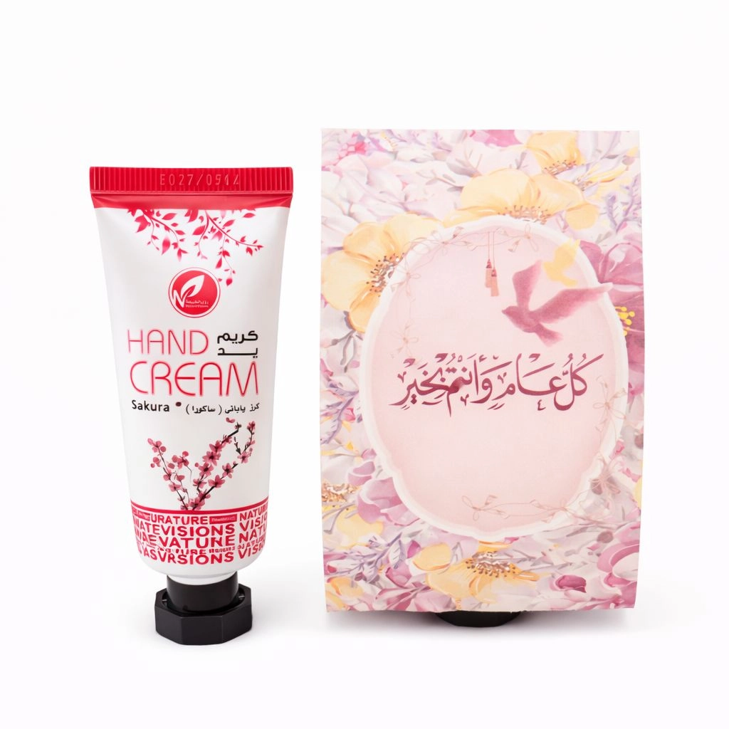 توزيعات العيد مع حامل ميني كريم اليد ساكورا - لون وردي - كل عام وأنتم بخير ( 5 قطع )