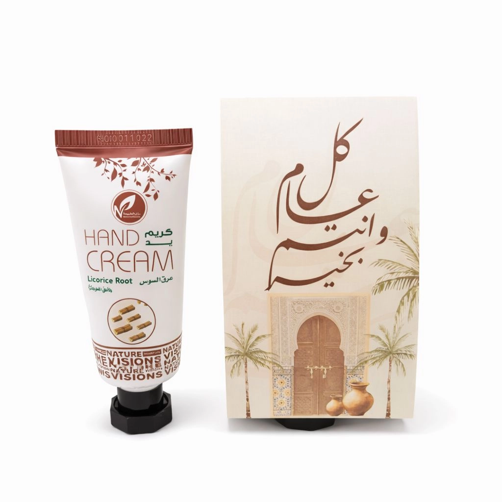 توزيعات العيد مع حامل ميني كريم اليد عرق السوس - لون بيج - كل عام وأنتم بخير ( 5 قطع )