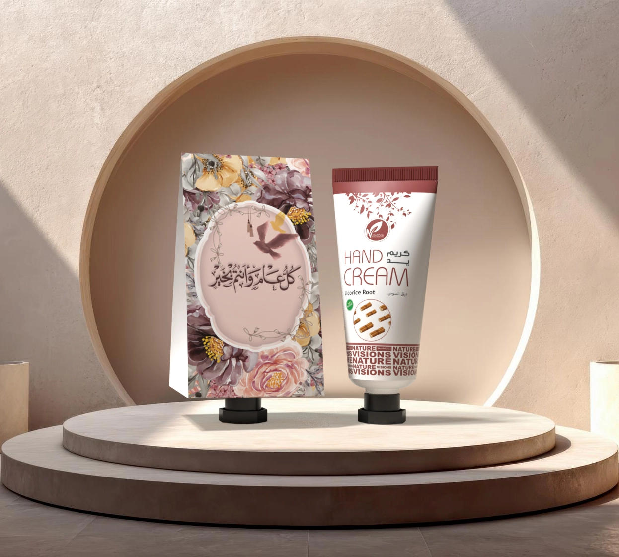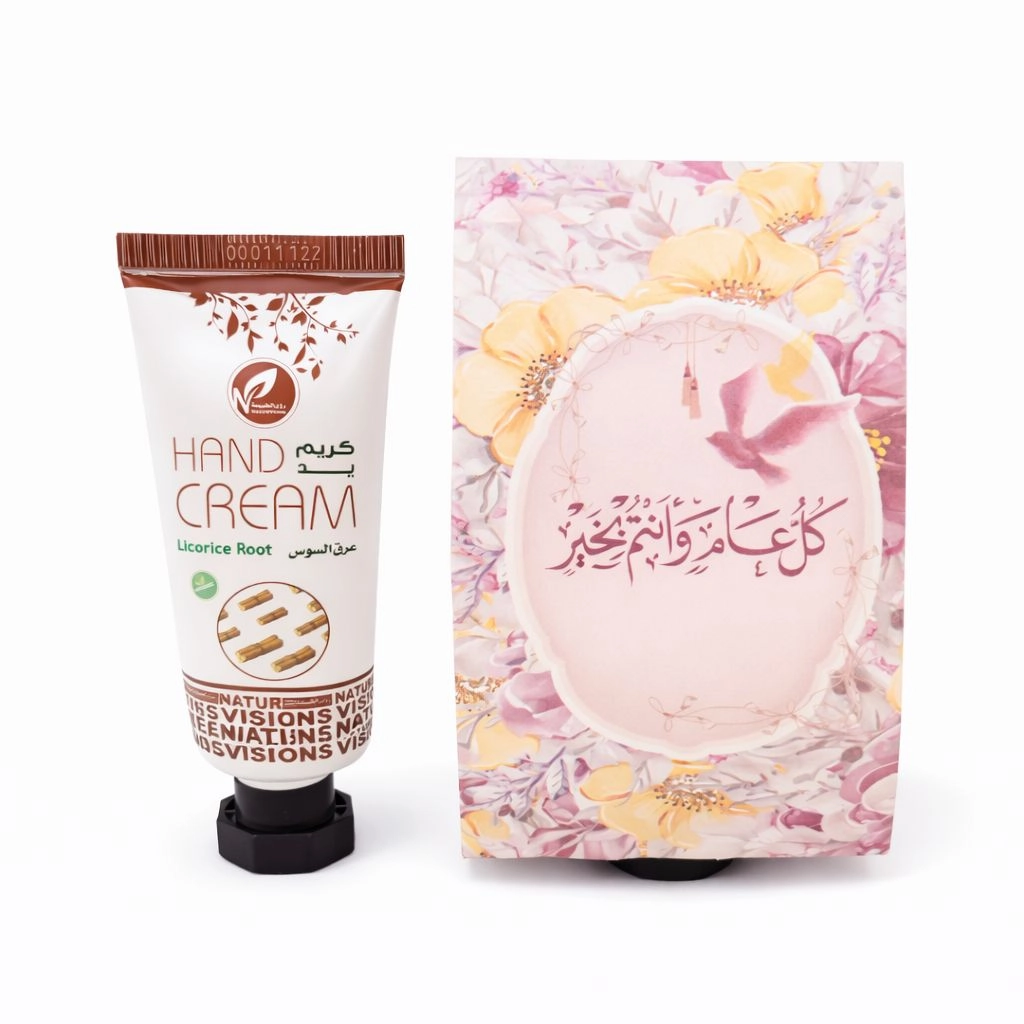 توزيعات العيد مع حامل ميني كريم اليد عرق السوس - لون وردي - كل عام وأنتم بخير ( 5 قطع )