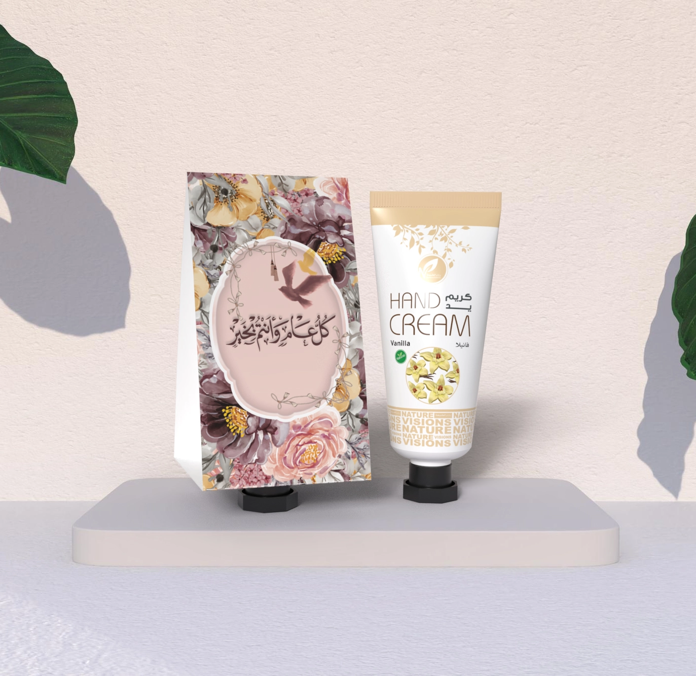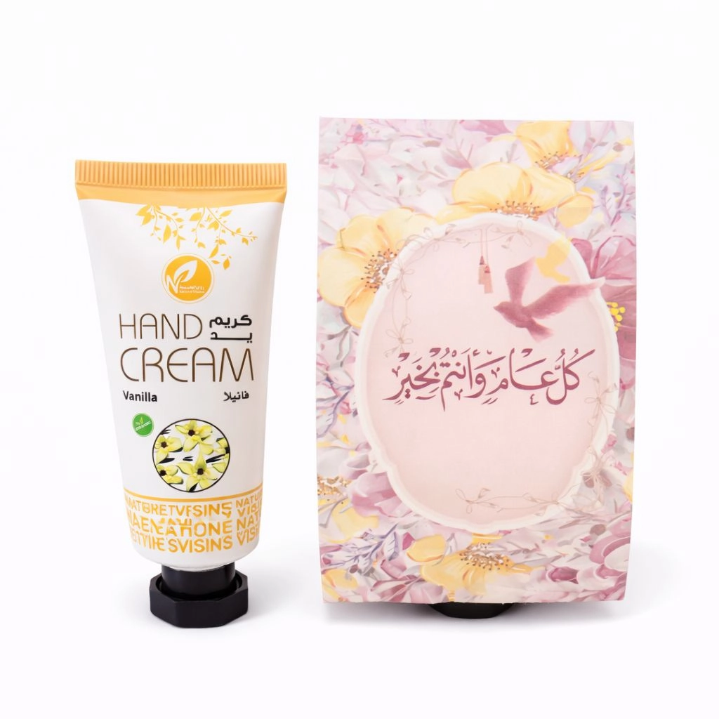 توزيعات العيد مع حامل ميني كريم اليد فانيلا - لون وردي - كل عام وأنتم بخير ( 5 قطع )