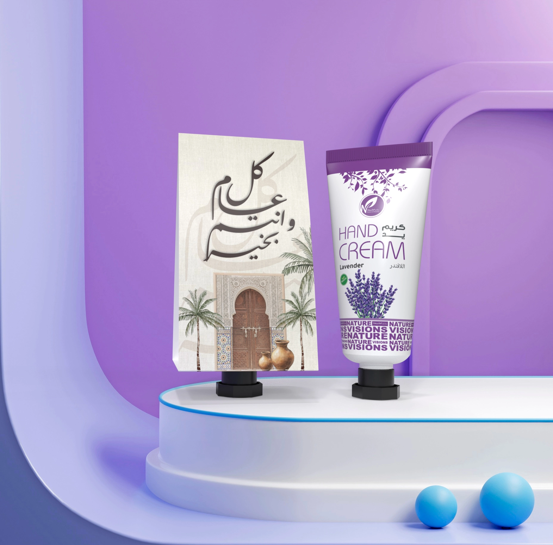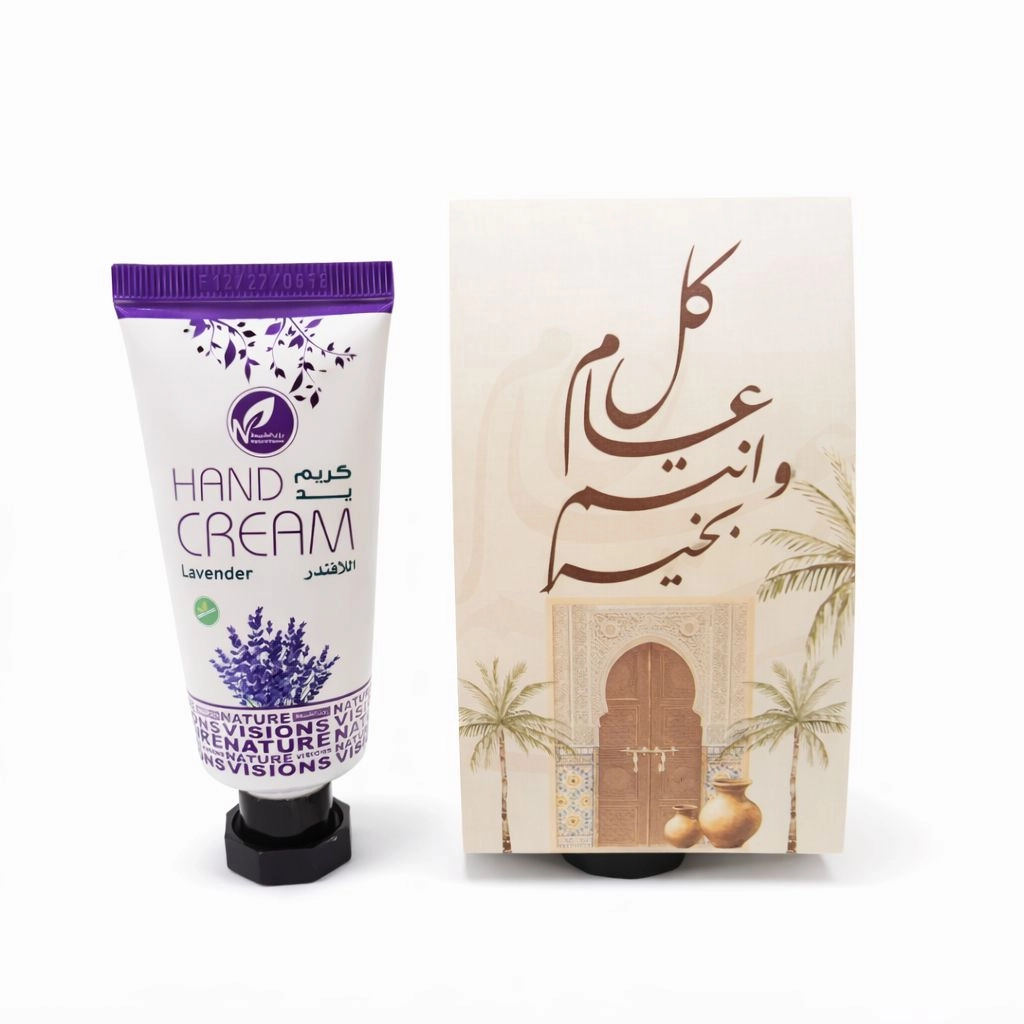 توزيعات العيد مع حامل ميني كريم اليد لافندر - لون بيج - كل عام وأنتم بخير ( 5 قطع )