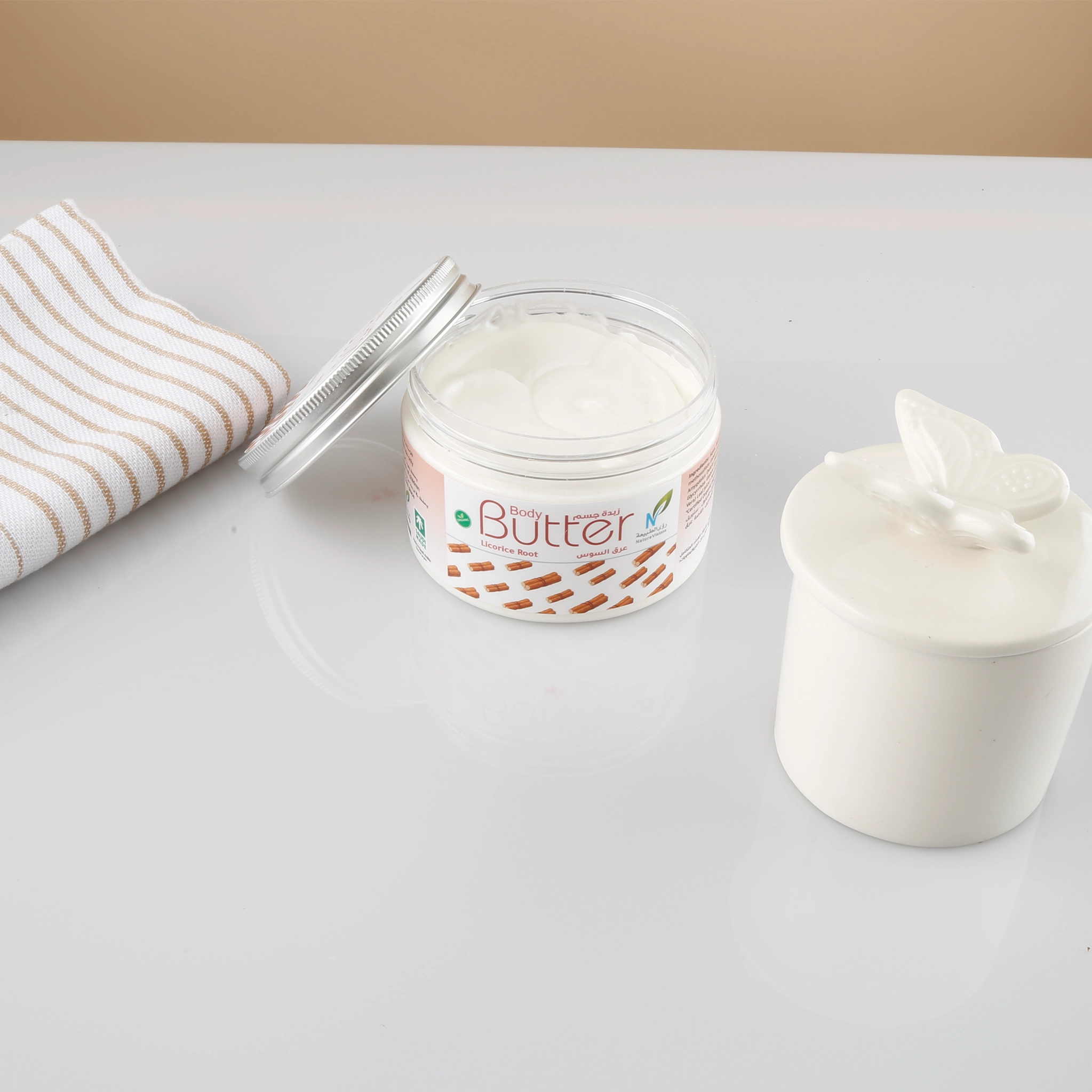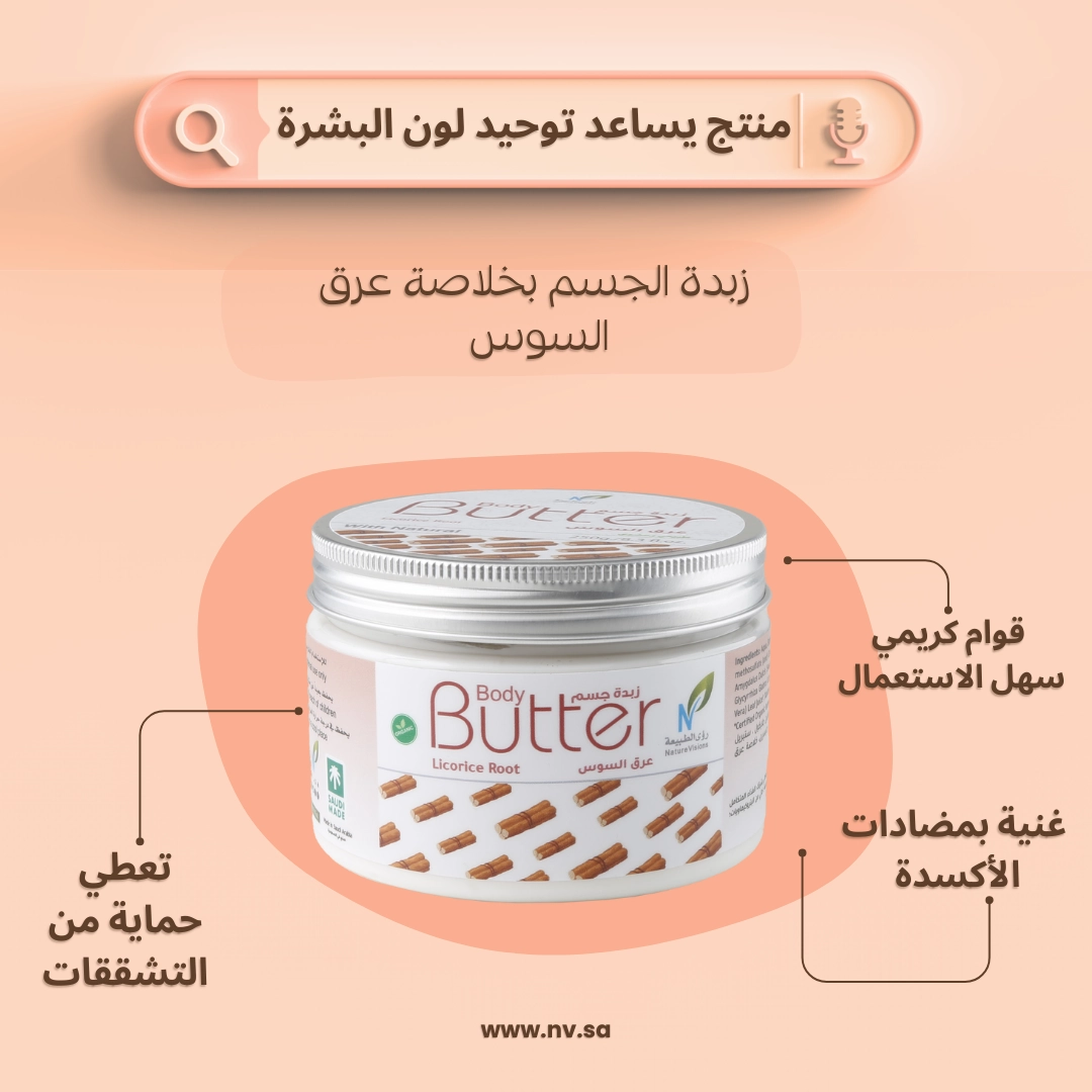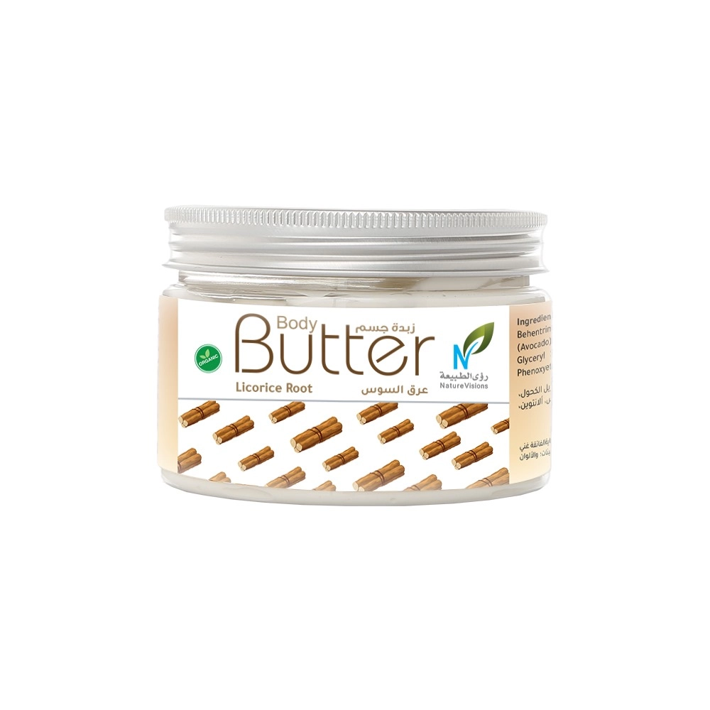 زبدة الجسم بخلاصة زيت عرق السوس الطبيعي مع زبدة الشيا، وزيت الجوجوبا، وزيت اللوز الحلو، وزيت الأفوكادو تركيبة فريدة وغنية لترطيب وتحسين لون بشرتك.