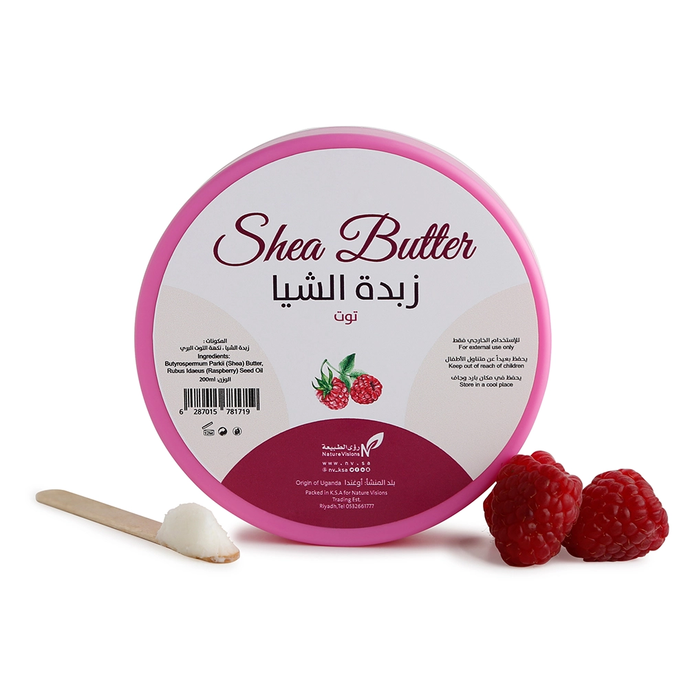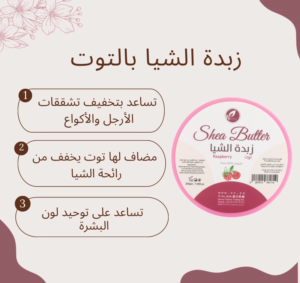 زبدة الشيا بالتوت تحتوي على شيا خام قوامها مثل الزبدات الخام تذوب وتتحول لزيت بحرارة الجسم وفي الصيف، وفي الشتاء تكون متماسكة أكثر ..