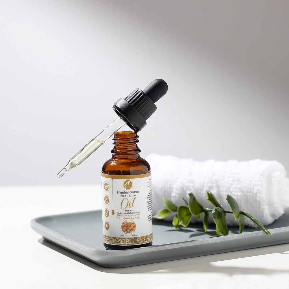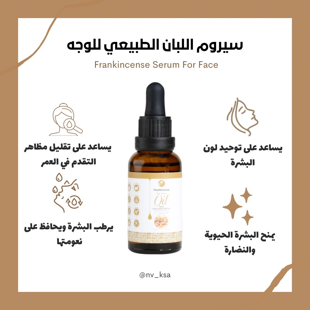 سيروم طبيعي للعناية بالوجه يحتوي على زيت اللبان الطبيعي (العماني) بالإضافة لمجموعة من الزيوت الطبيعية مثل زيت الأرجان وفيتامين E ، و زيت الجوجوبا و المورينجا