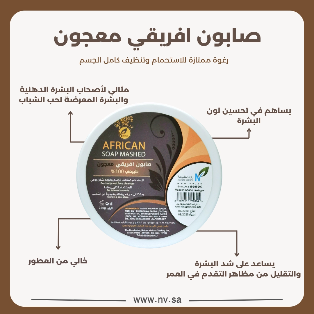 الصابون الافريقي الطبيعي هو أفضل بديل للصابون العادي الصناعي وخاصة المعطر بالعطور التي تعمل على اسمرار البشرة، إنه صابون طبيعي وخالي من مواد التنظيف الكيميائية الضارة.