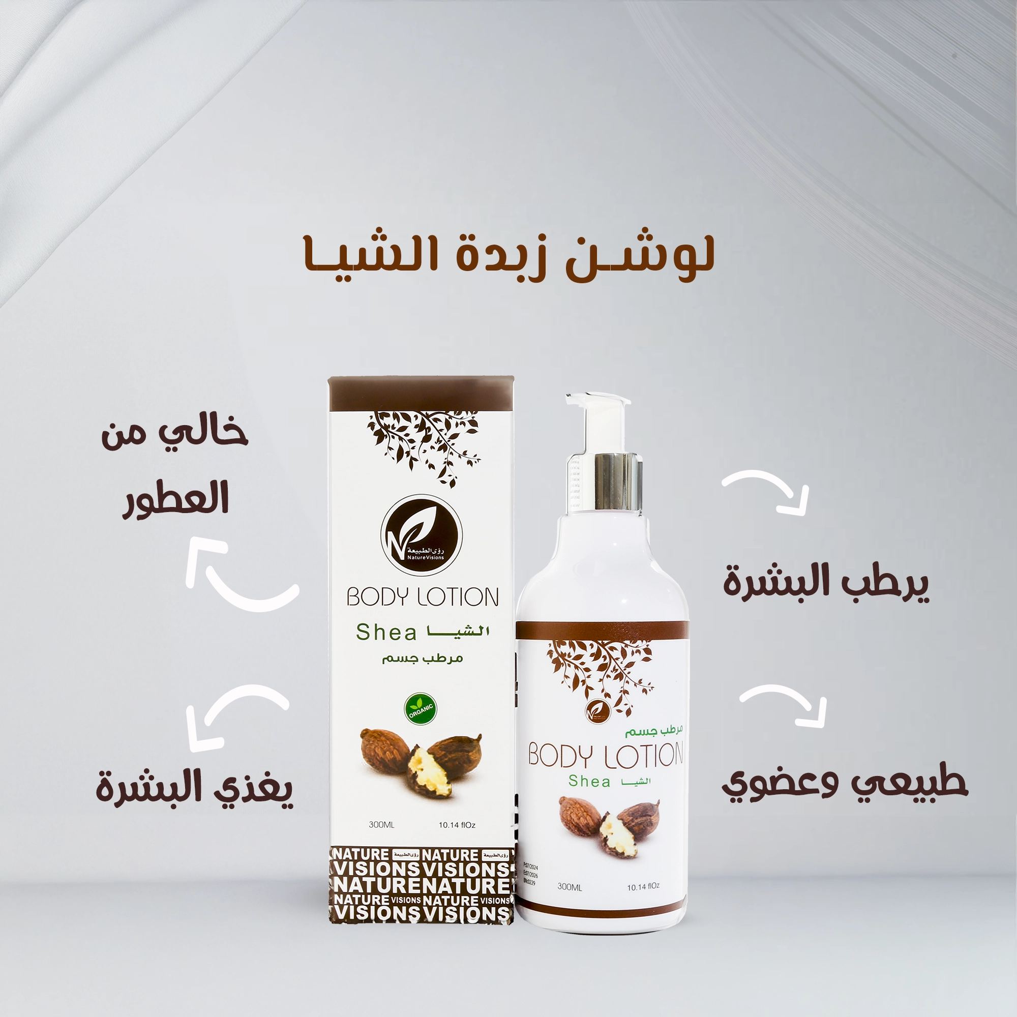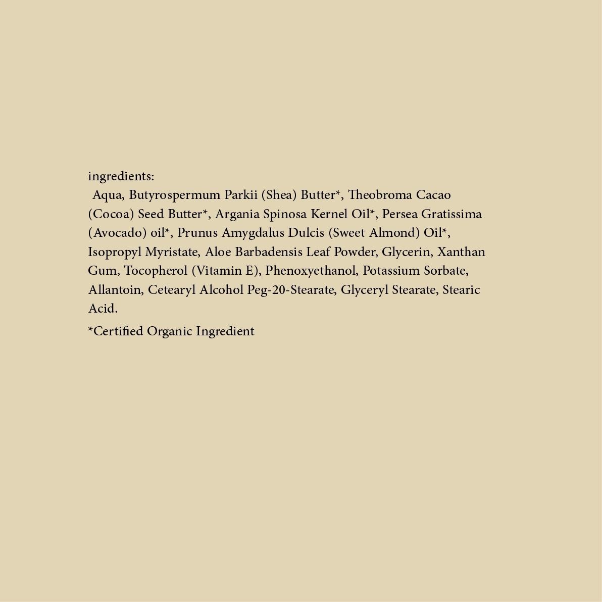 لوشن للجسم غني بزبدة الشيا و وزبدة الكاكاو مع زيت الأفوكادو وزيت الأرجان و زيت اللوز الحلو وفيتامين E ..تركيبة فريدة وغنية لترطيب بشرتك.. غني بمضادات الأكسدة لإكساب البشرة حيويتها، وحمايتها من التشققات. خالي من البتروكيماويات، والبارابينات، والألوان والمواد الحافظة الضارة، والزيوت المعدنية وكذلك السيليكون.