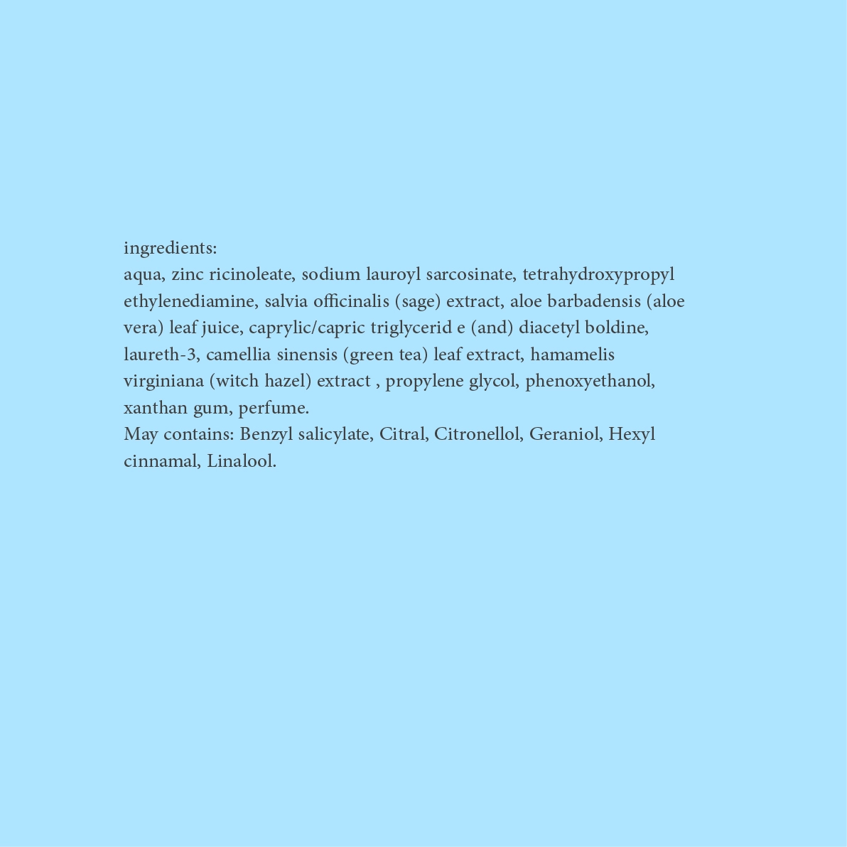 خالي من البتروكيماويات، خالي من البارابين، خالي من الألمنيوم، خالي من الكحول ،خالي من الألوان والمواد الحافظة الضارة، خالي من الزيوت المعدنية.