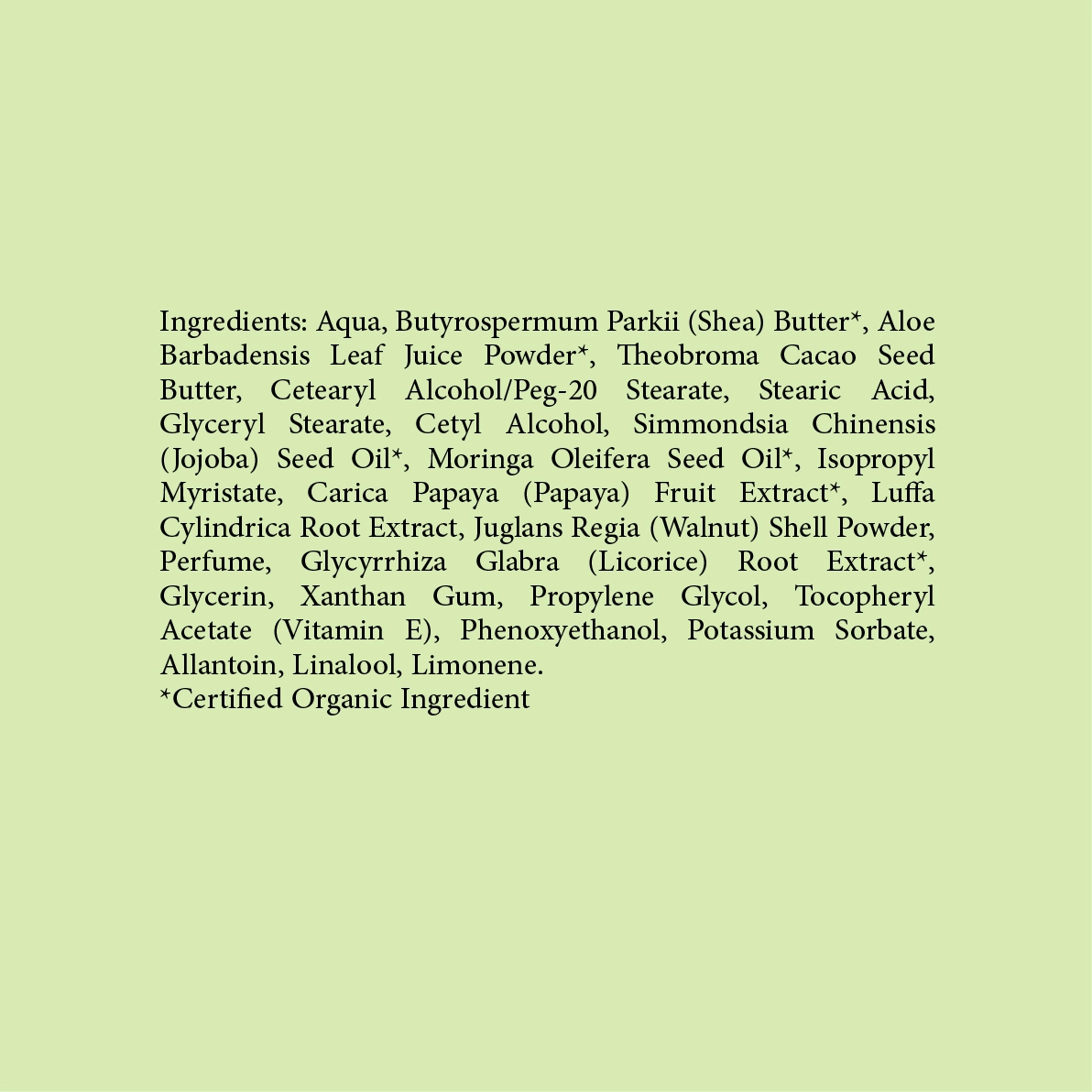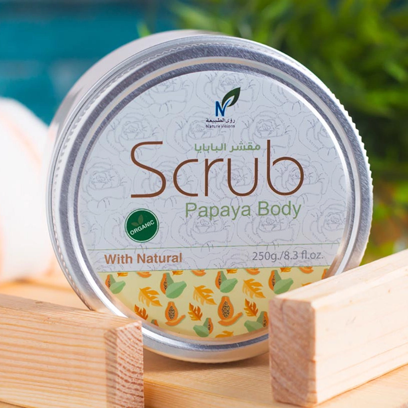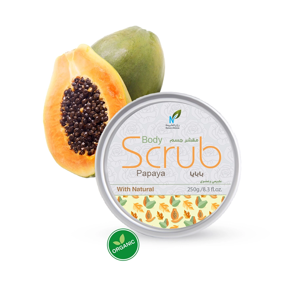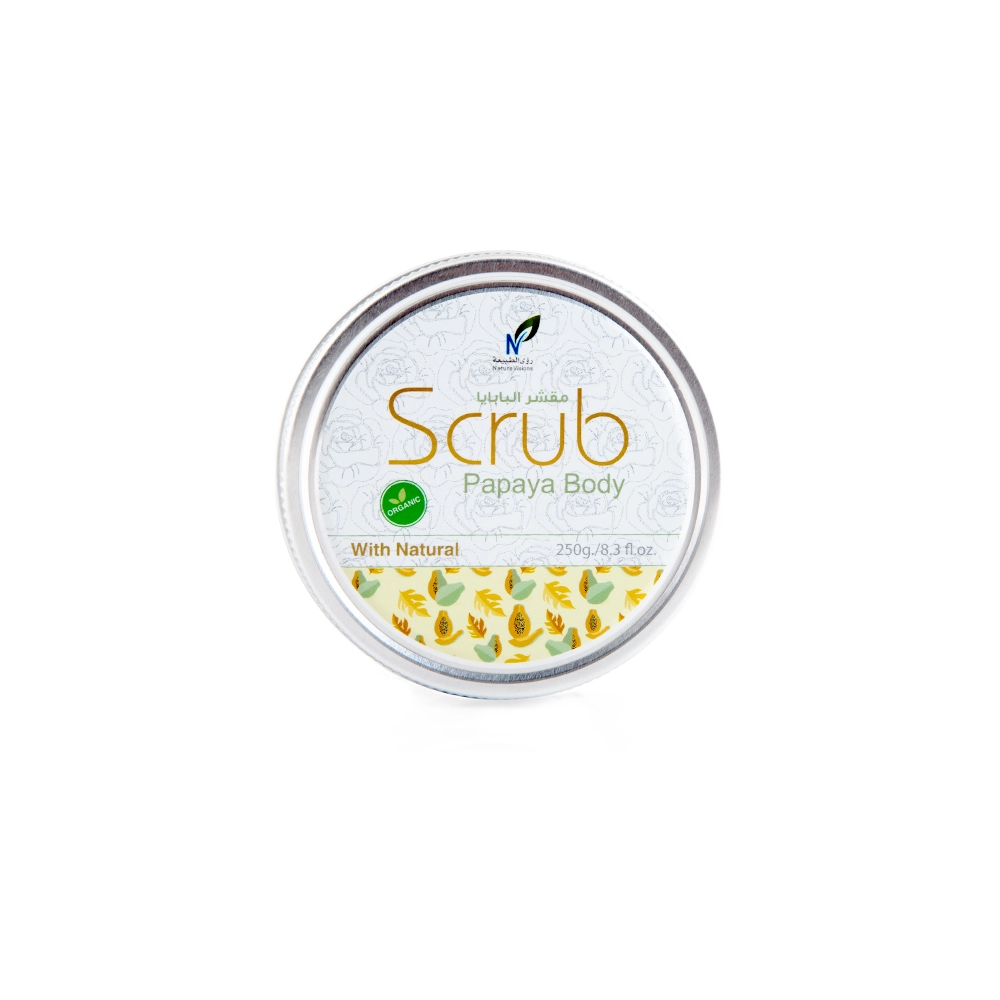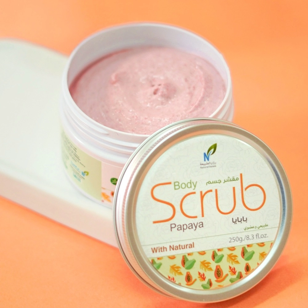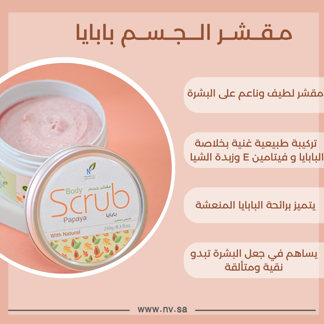 مقشر البابايا ذو التركيبة الطبيعية والغنية بخلاصة البابايا الفعالة مع فيتامين(E) وزبدة الشيا، وزيت اللوز الحلو، وزيت الأفوكادو، وزيت الجوجوبا.