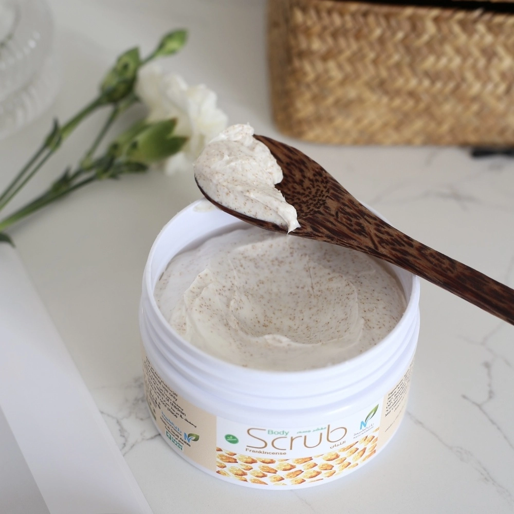 مقشر الجسم ذو التركيبة الطبيعية والغنية بحبيبات الجوز واللوفا الطبيعية مع خلاصة زيت اللبان العماني " الحوجري" و فيتامين(E)، وزبدة الشيا ، وزيت اللوز الحلو، وزيت الأفوكادو ، وزيت الجوجوبا