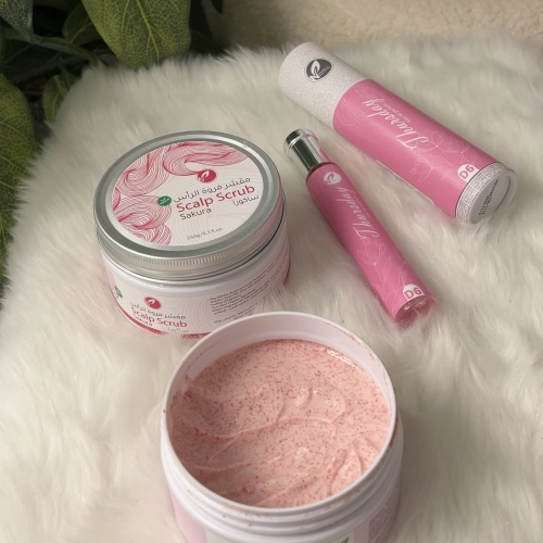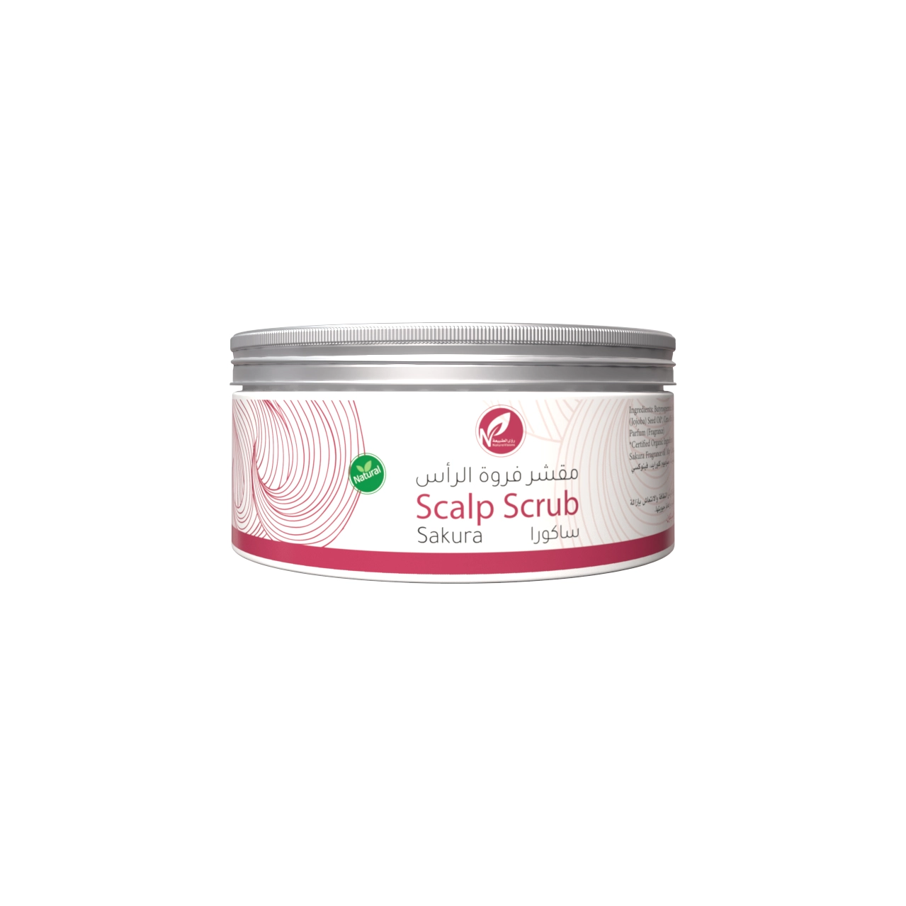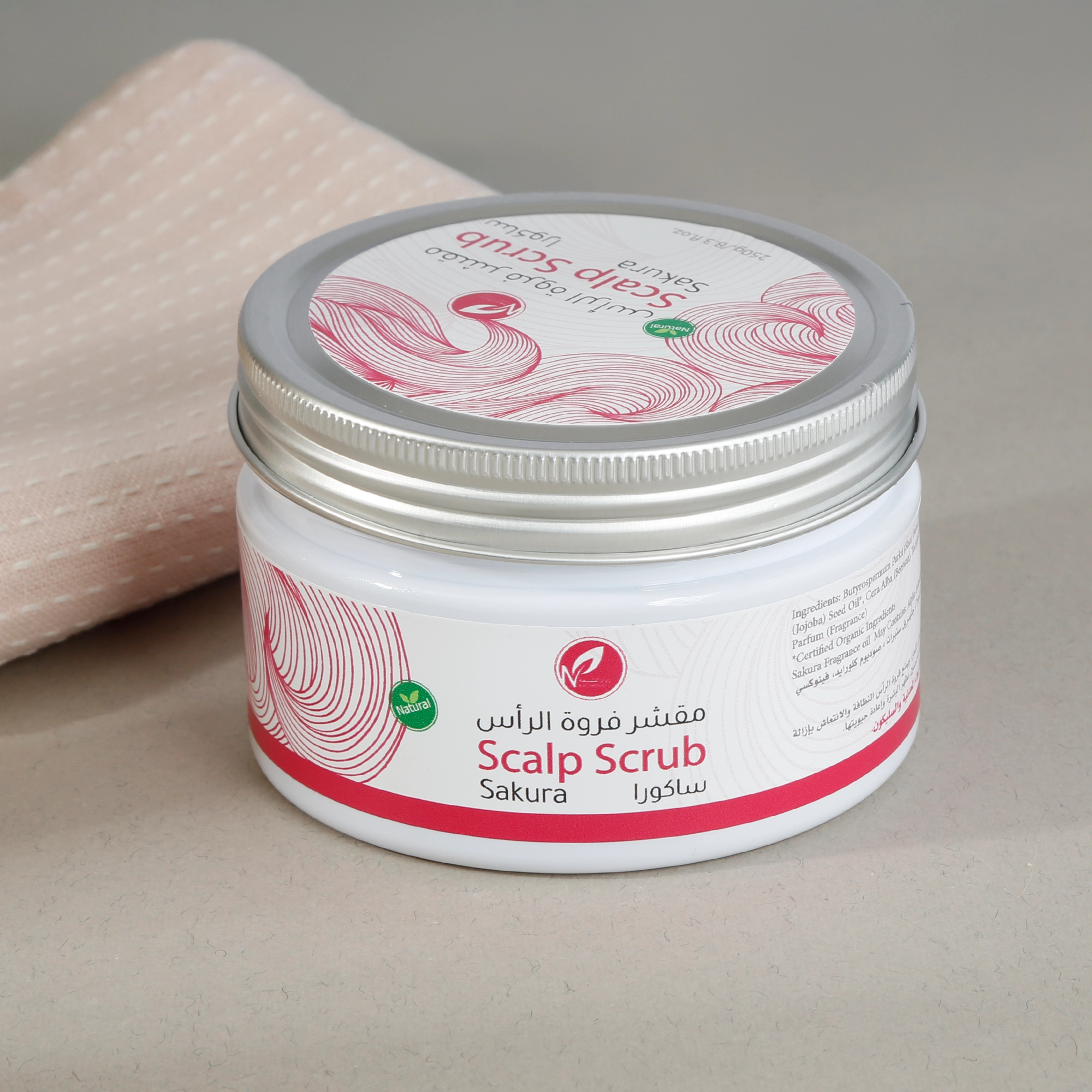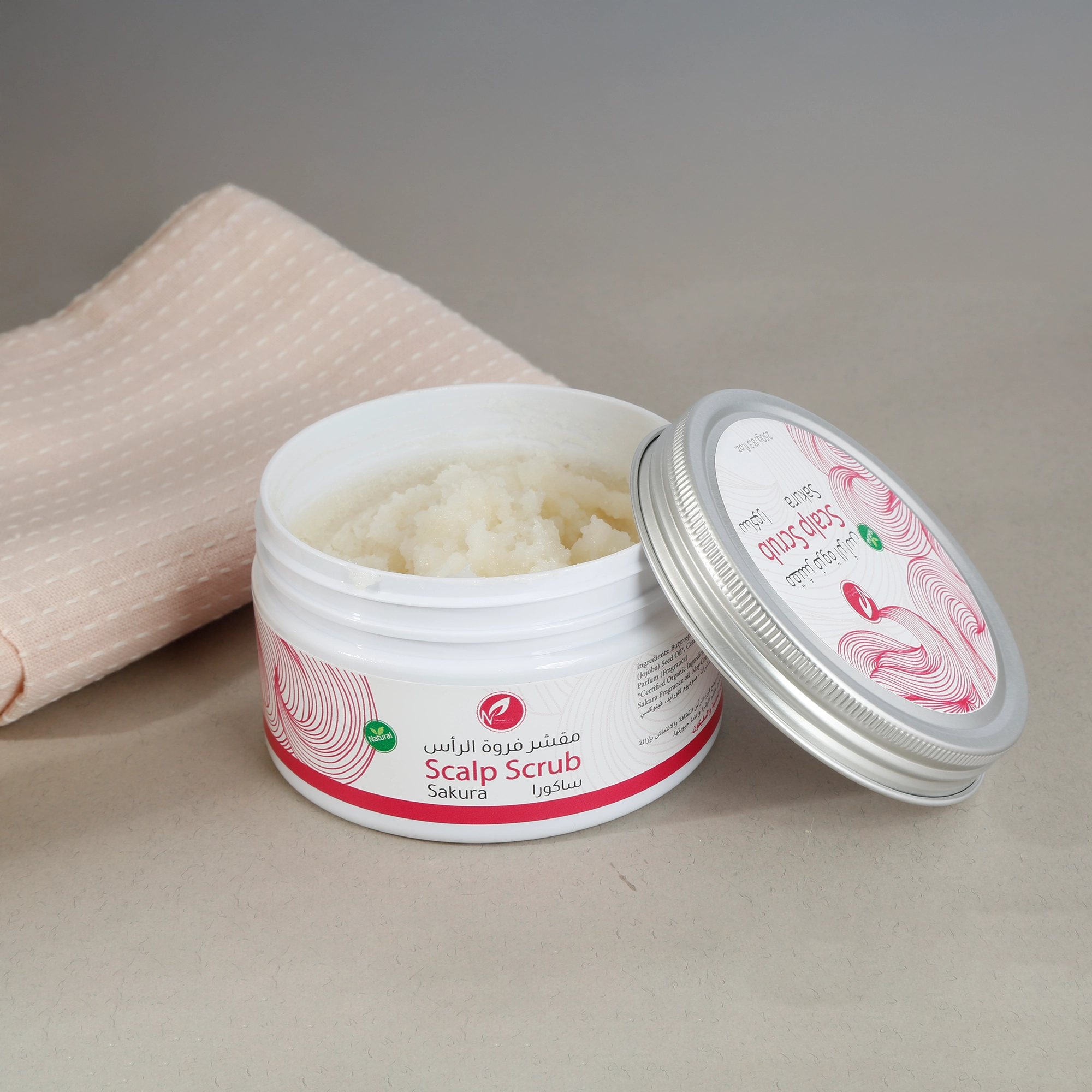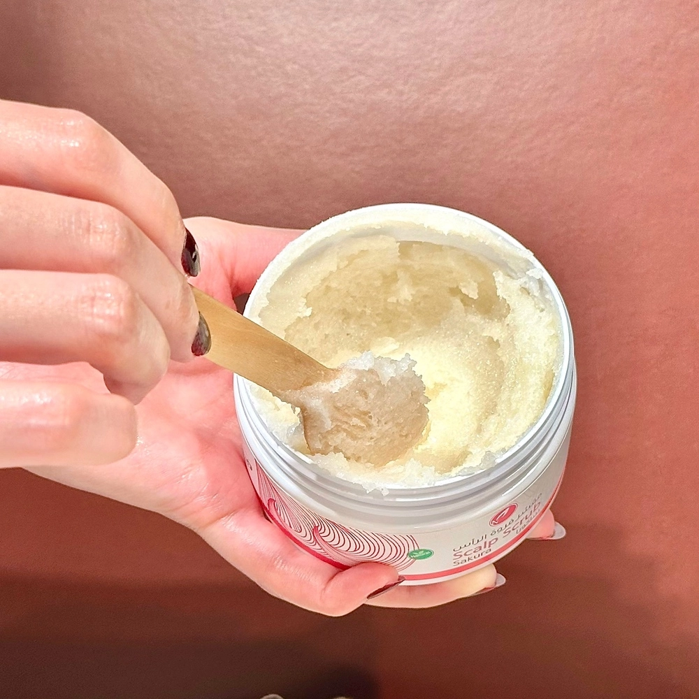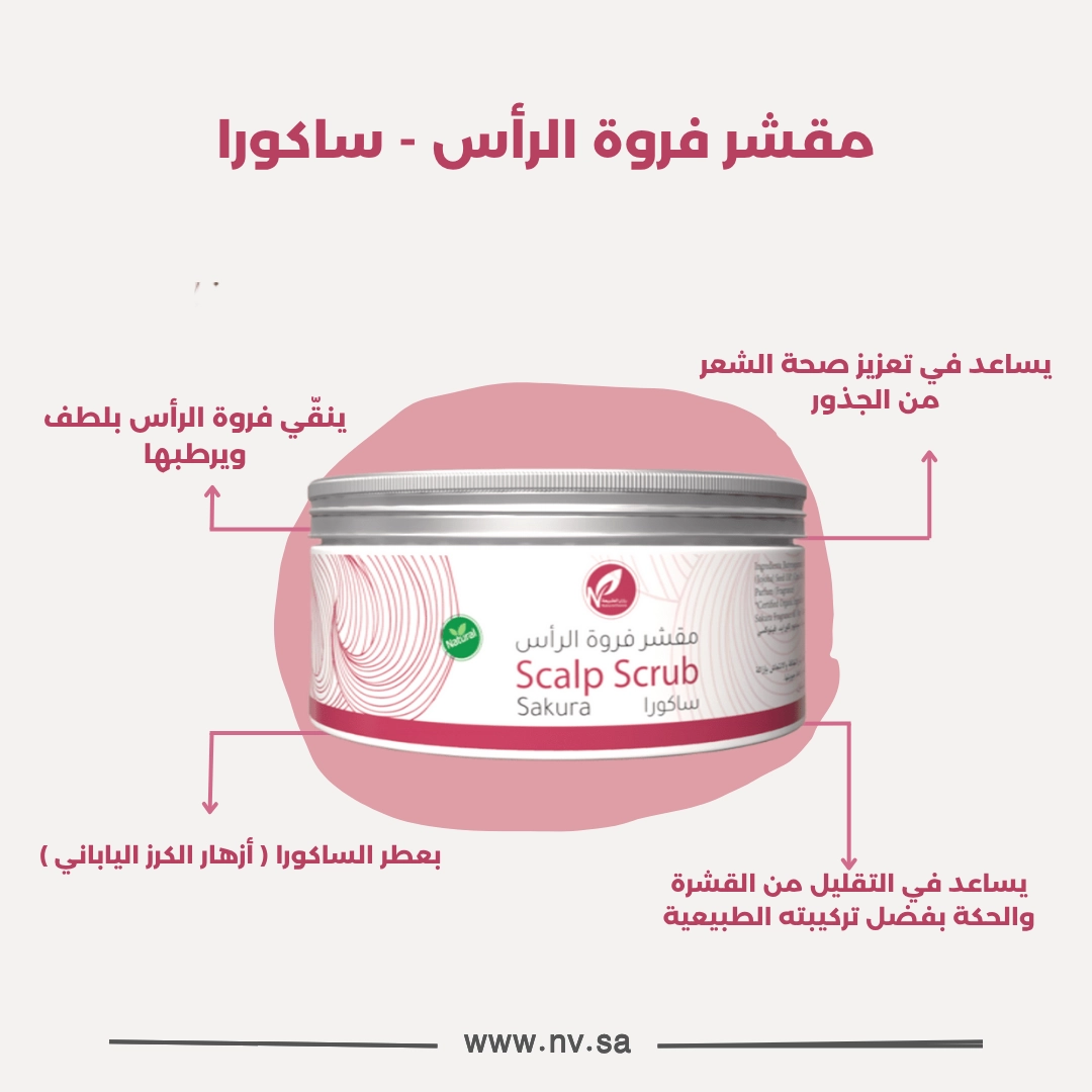 مقشر فروة الرأس ذو التركيبة الطبيعية والغنية بالملح البحري مع فيتامين(E)، وزبدة الشيا ، وزيت جوز الهند ، وزيت الجوجوبا و الممزوجة بعطر زهرة الكرز الياباني ( الساكورا )