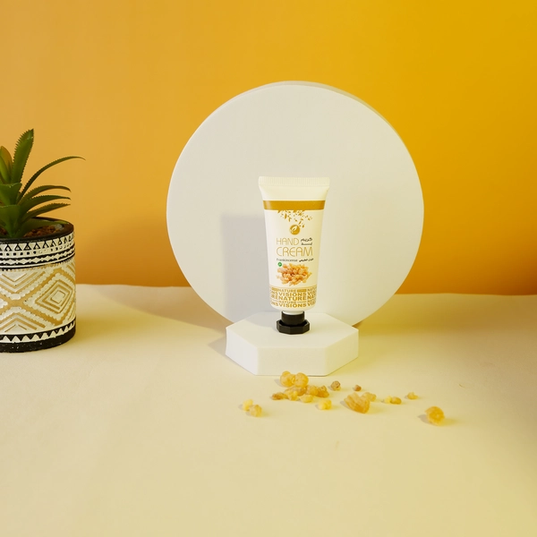 كريم اليدين بخلاصة زيت اللبان العماني الطبيعي مع زيت اللوز الحلو وزيت الأفوكادو وزيت الجوجوبا وفيتامين E تركيبة فريدة وغنية لترطيب اليدين .