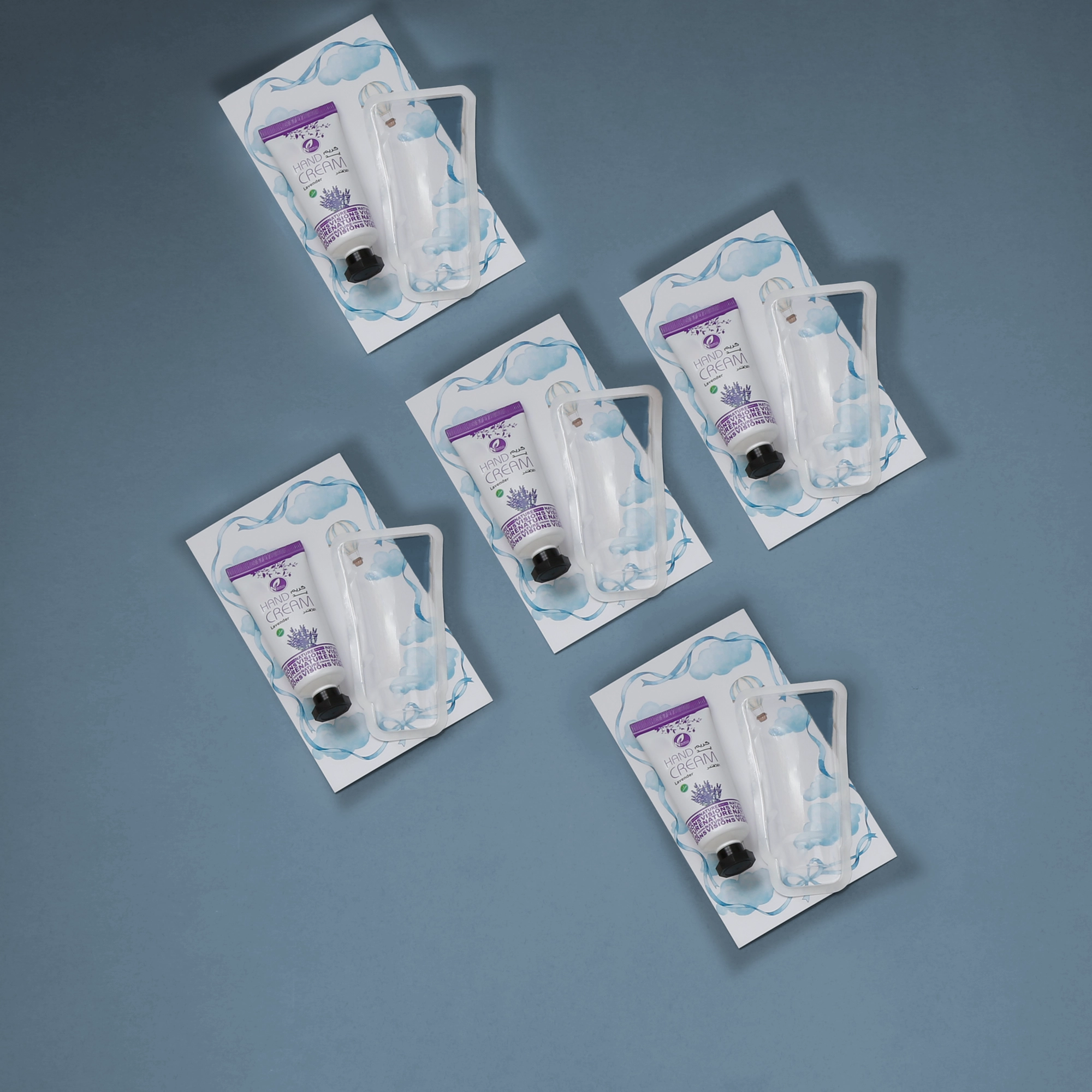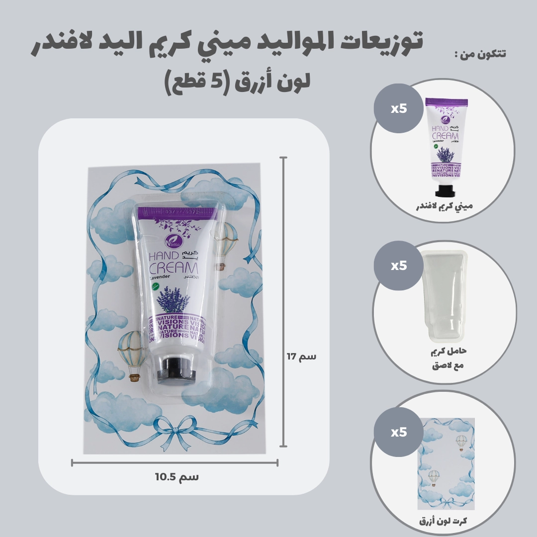 مجموعة توزيعات المواليد لون أزرق بدون نصوص - ميني كريم اليد لافندر ( 5 قطع )، مناسب لتوزيعات الهدايا و المناسبات.