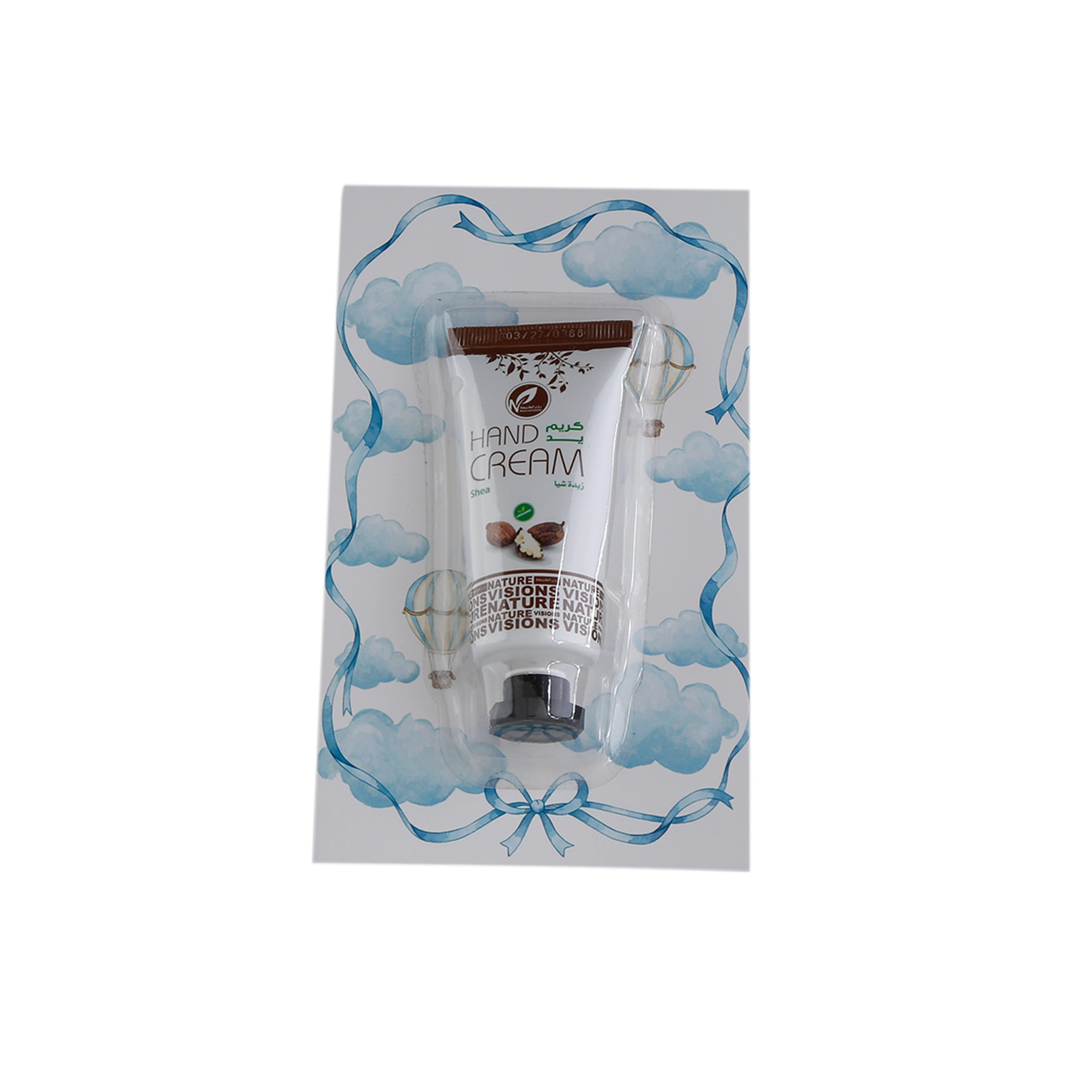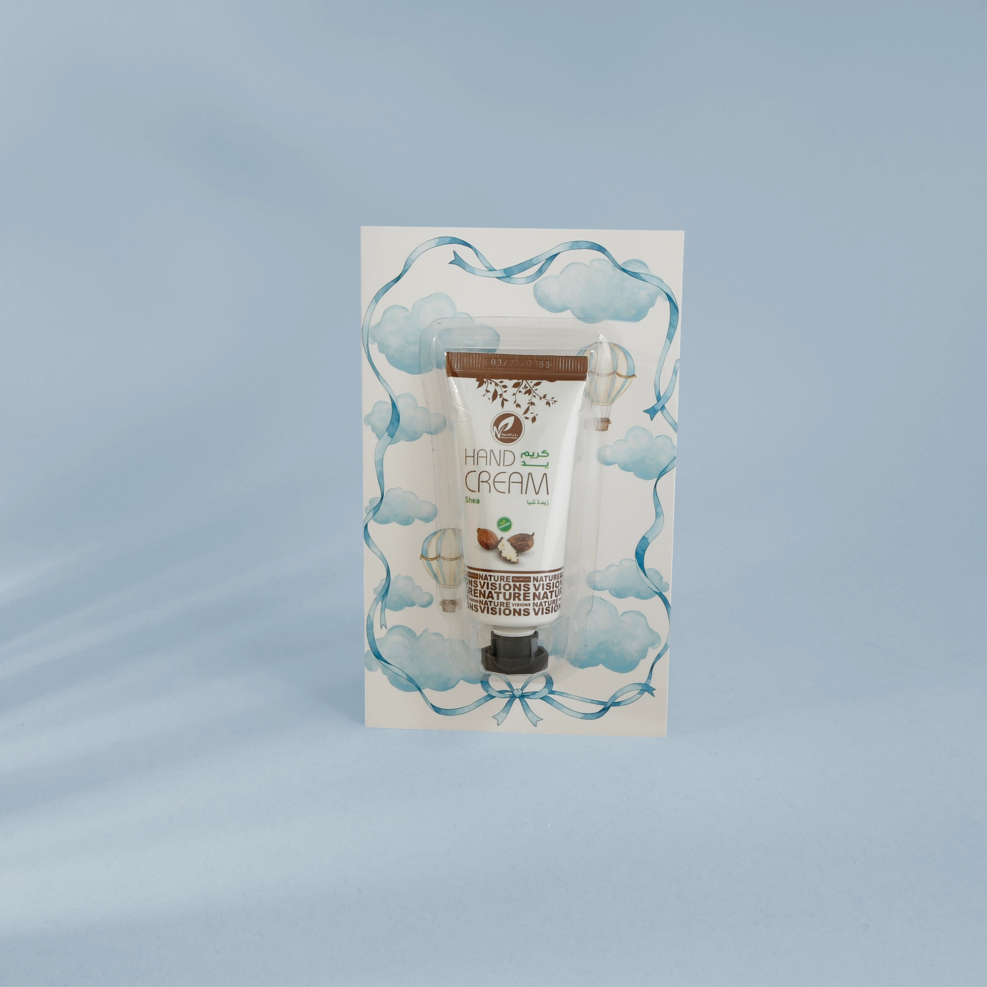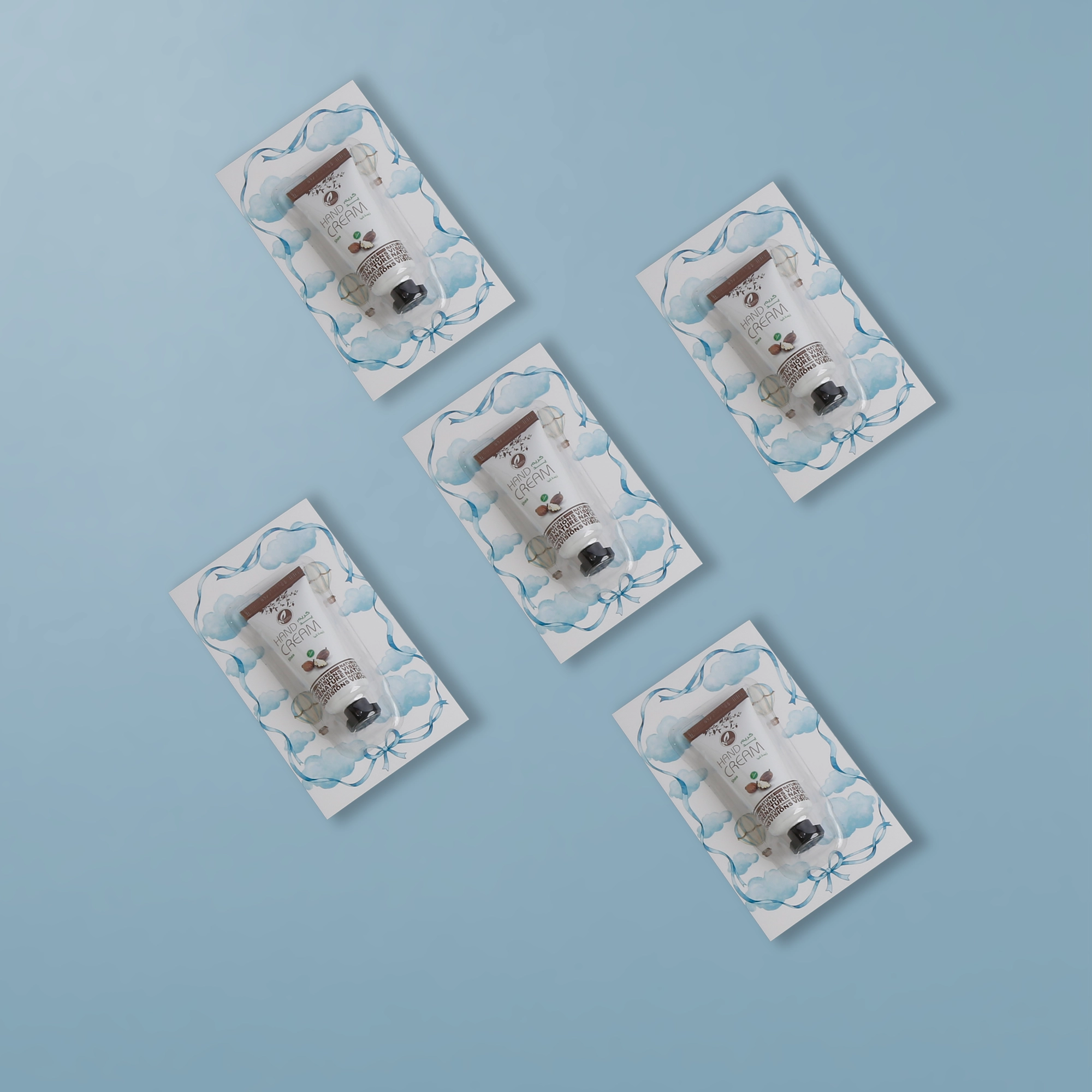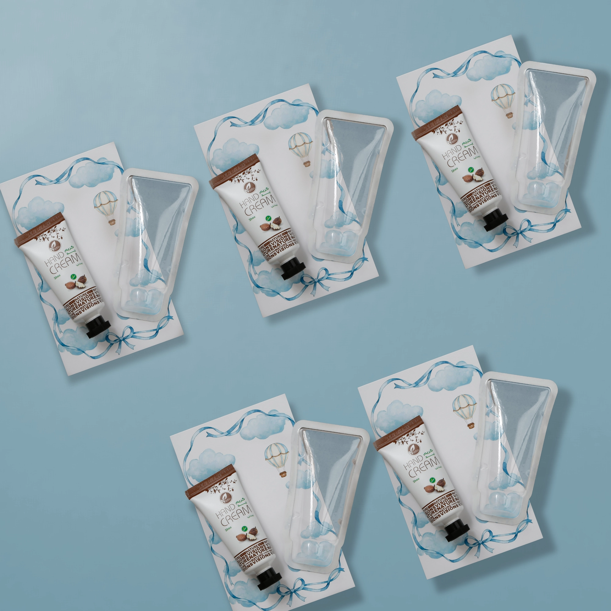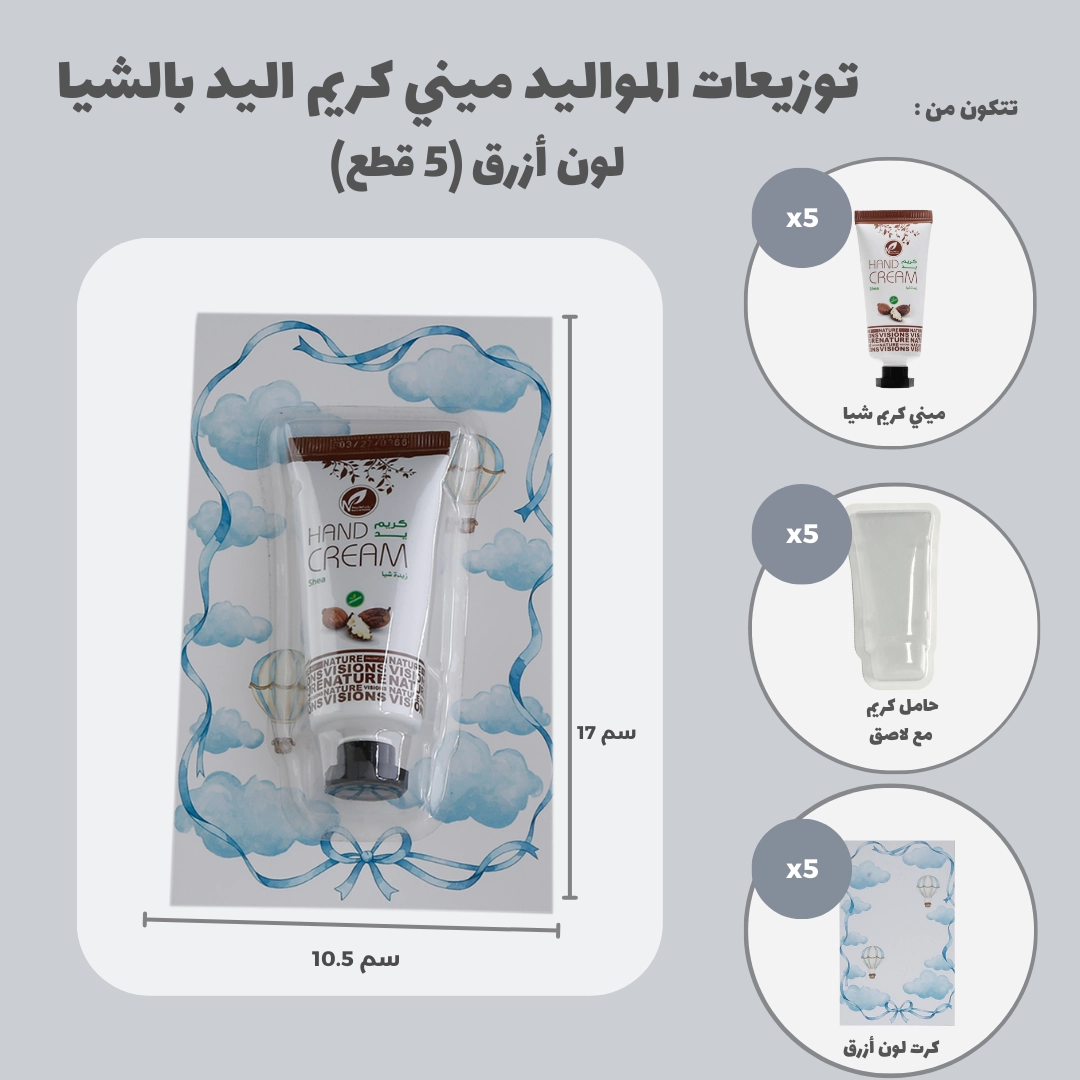 مجموعة توزيعات المواليد لون أزرق بدون نصوص - ميني كريم اليد شيا ( 5 قطع )، مناسب لتوزيعات الهدايا و المناسبات.