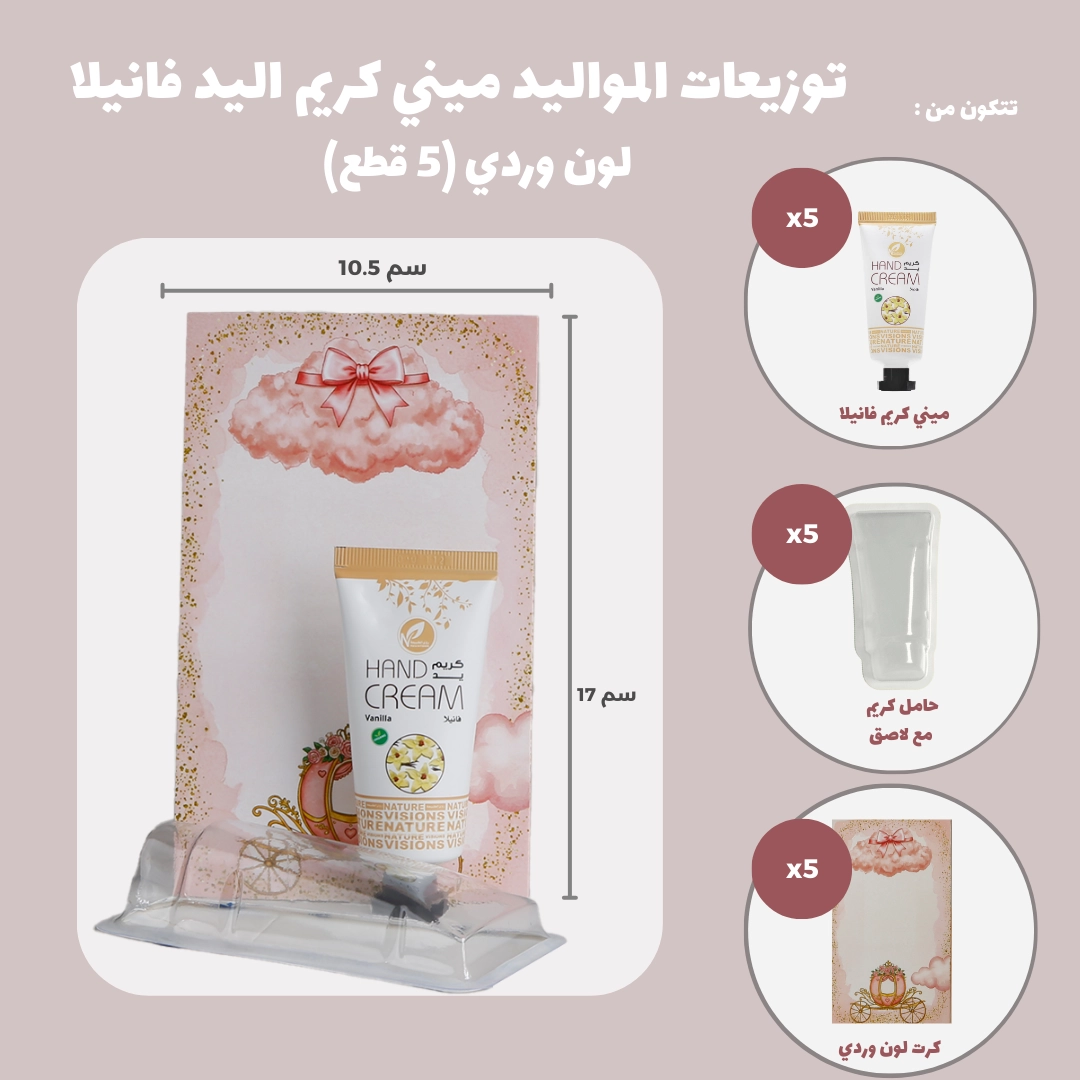 مجموعة توزيعات المواليد لون وردي بدون نصوص - ميني كريم اليد فانيلا ( 5 قطع )، مناسب لتوزيعات الهدايا و المناسبات.