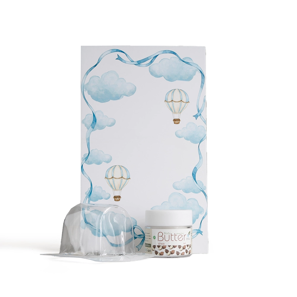 مجموعة توزيعات المواليد لون أزرق بدون نصوص - ميني زبدة الجسم شيا ( 5 قطع )، مناسب لتوزيعات الهدايا و المناسبات.